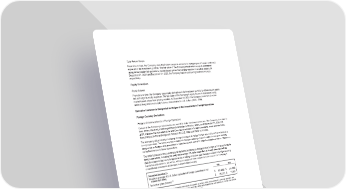 Total Return Swaps From time to time, the Company uses total return swaps as a means to manage spread duration and credit exposure in its investment portfolio. The fair value of the Company’s total return swaps is determined using broker-dealer bid quotations, market-based prices from pricing vendors or valuation models. At December 31, 2021 and December 31, 2020, the Company had no outstanding total return swaps, respectively. Equity Derivatives Equity Futures From time to time, the Company uses equity derivatives in its investment portfolio to either assume equity risk or hedge its equity exposure. The fair value of the Company’s equity futures is determined using market-based prices from pricing vendors. At December 31, 2021, the Company had a $74.3 million notional long position of equity futures, denominated in U.S. dollars (2020 - $Nil). Derivative Instruments Designated as Hedges of Net Investments in Foreign Operations Foreign Currency Derivatives Hedges of Net Investments in Foreign Operations Certain of the Company’s subsidiaries use non-U.S. dollar functional currencies. The Company, from time to time, enters into foreign exchange forwards to hedge currencies, which, as of December 31, 2021 and 2020, includes the Australian dollar and Euro net investment in foreign operations, on an after-tax basis, from changes in the exchange rate between the U.S. dollar and these currencies. The Company utilizes foreign exchange forward contracts to hedge the fair value of its net investment in a foreign operation. The Company has entered into foreign exchange forward contracts that were formally designated as hedges of its investment in subsidiaries with non-U.S. dollar functional currencies. There was no ineffectiveness in these transactions. The table below provides a summary of derivative instruments designated as hedges of net investments in foreign operations, including the weighted average U.S. dollar equivalent of foreign denominated net (liabilities) assets that were hedged and the resulting derivative gain that are recorded in foreign currency translation adjustments, net of tax, within accumulated other comprehensive loss on the Company’s consolidated statements of changes in shareholders’ equity: Year ended December 31, 2021 2020 Weighted average of U.S. dollar equivalent of foreign denominated net assets (liabilities) $ (66,438) $ (45,803) Derivative gains (losses) (1) $ (4,535) $ 11,685 (1) Derivative gains (losses) from derivative instruments designated as hedges of the net investment in a foreign operation are recorded in foreign currency translation adjustments, net of tax, within accumulated other comprehensive income (loss) on the Company’s consolidated statements of changes in shareholders’ equity. NOTE 20. COMMITMENTS, CONTINGENCIES AND OTHER ITEMS Concentration of Credit Risk Instruments which potentially subject the Company to concentration of credit risk consist principally of investments, including the Company’s equity method investments, cash, premiums receivable and reinsurance balances. The Company limits the amount of credit exposure to any one financial institution and, except for the securities of the U.S. Government and U.S. Government related entities, and money market securities, none of the Company’s fixed-maturity and short-term investments exceeded 10% of shareholders’ equity at December 31, 2021. Refer to “Note 7. Reinsurance,” for information with respect to reinsurance recoverable. F-89