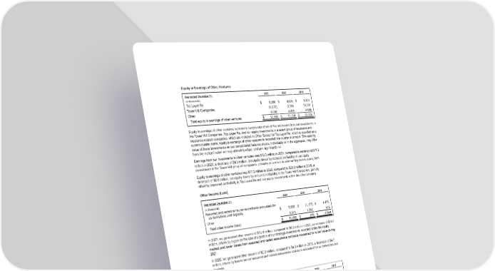 Equity in Earnings of Other Ventures Year ended December 31, 2021 2020 2019 (in thousands) Top &ayer Re $ 8,286 $ 9,595 $ 8,801 Tower "ill Companies (2,073) 3,104 10,337 )ther 6,096 4,495 4,086 Total equity in earnings of other ventures $ 12,309 $ 17,194 $ 23,224 quity in earnings of other ventures represents our prorata share of the net income from our investments in the Tower "ill Companies, Top &ayer Re, and our equity investments in a select group of insurance and insurancerelated companies, which are included in )ther. xcept for Top &ayer Re, which is recorded on a current quarter basis, equity in earnings of other ventures is recorded one quarter in arrears. The carrying value of these investments on our consolidated balance sheets, individually or in the aggregate, may differ from the realized value we may ultimately attain, perhaps significantly so. arnings from our investments in other ventures was $12.3 million in 2021, compared to earnings of $17.2 million in 2020, a decrease of $4.9 million, principally driven by reduced profitability of our equity investments in the Tower "ill group of companies, primarily as a result of underwriting losses during 2021. quity in earnings of other ventures was $17.2 million in 2020, compared to $23.2 million in 2019, a decrease of $6.0 million, principally driven by reduced profitability in the Tower "ill Companies, partially offset by improved profitability in Top &ayer Re and our equity investments within the other category . Other Income (Loss) Year ended December 31, 2021 2020 2019 (in thousands) ssumed and ceded reinsurance contracts accounted for as derivatives and deposits $ 5,905 $ (1,177) $ 4,473 )ther 4,975 1,390 476 Total other income (loss) $ 10,880 $ 213 $ 4,949 In 2021, we generated other income of $10.9 million, compared to $0.2 million in 2020, an increase of $10.7 million, driven by a gain on the sale of a portion of our strategic investments recorded under the equity method and lower losses from assumed and ceded reinsurance contracts accounted for at fair value during 2021. In 2020, we generated other income of $0.2 million, compared to $4.9 million in 2019, a decrease of $4.7 million, driven by losses on our assumed and ceded reinsurance contracts accounted for as derivatives and deposits. Corporate Expenses Year ended December 31, 2021 2020 2019 (in thousands) Total corporate expenses $ 41,152 $ 96,970 $ 94,122 Corporate expenses include certain executive, director, legal and consulting expenses, costs for research and development, impairment charges related to goodwill and other intangible assets, and other miscellaneous costs, including those associated with operating as a publicly traded company. In 2020 and 2019, corporate expenses also included costs incurred in connection with the acquisition of T'R. rom time to time, we may revise the allocation of certain expenses between corporate and operating expenses to better reflect the characteristic of the underlying expense. 87