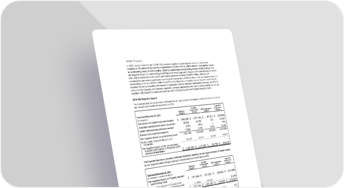 COVID-19 Losses In 2020, losses related to the COVID-19 pandemic resulted in a net negative impact on net income available to RenaissanceRe common shareholders of $286.6 million, which reflects a net negative impact on underwriting result of $351.9 million, offset by redeemable noncontrolling interest of $65.4 million. The net negative impact on underwriting result had a 8.9 percentage point impact on the consolidated combined ratio, and is comprised of net claims and claims expenses incurred of $385.6 million, offset by net reinstatement premiums earned and earned profit commissions of $33.6 million. The net negative impact on underwriting result was $235.0 million in the Property Segment, principally representing the cost of claims incurred but not yet reported with respect to exposures such as business interruption coverage, and $117.0 million for the Casualty and Specialty segment, primarily representing the cost of claims incurred but not yet reported, with respect to exposures such as event contingency and event-based casualty covers. 2019 Net Negative Impact The financial data below provides additional details regarding the net negative impact of certain events on our consolidated results of operations in 2019. .ear ended December 31, 2019 )yAhoon Hagibis &3 2019 CatastroAhe Gents 2019 ggregate Losses )otal 2019 Large Loss Gents (in thousands) Net claims and claims expenses incurred $ (199,305) $ (187,188) $ (97,591) $ (484,084) Assumed reinstatement premiums earned 28,829 24,596 183 53,608 Ceded reinstatement premiums earned (219) (574) — (793) Earned (lost) profit commissions 7,509 3,100 1,740 12,349 Net negative impact on underwriting result (163,186) (160,066) (95,668) (418,920) Redeemable noncontrolling interest - DaVinciRe 35,078 22,677 12,932 70,687 Net negative impact on net income (loss) available (attributable) to RenaissanceRe common shareholders $ (128,108) $ (137,389) $ (82,736) $ (348,233) The financial data below provides additional information detailing the net negative impact of certain events on our segment underwriting results and consolidated combined ratio in 2019. .ear ended December 31, 2019 )yAhoon Hagibis &3 2019 CatastroAhe Gents 2019 ggregate Losses )otal 2019 Large Loss Gents (in thousands, except percentages) Net negative impact on Property segment underwriting result $ (161,654) $ (157,064) $ (95,668) $ (414,386) Net negative impact on Casualty and Specialty segment underwriting result (1,532) (3,002) — (4,534) Net negative impact on underwriting result $ (163,186) $ (160,066) $ (95,668) $ (418,920) Percentage point impact on consolidated combined ratio 5.0 4.9 2.8 12.9 77