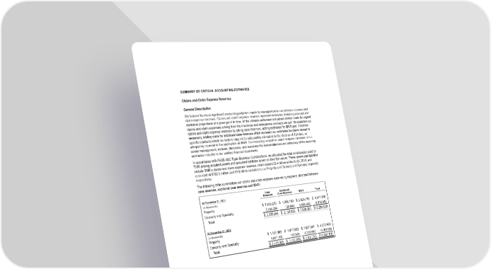 SUMMARY OF CRITICAL ACCOUNTING ESTIMATES Claims and Claim Expense Reserves General Description We believe the most significant accounting judgment made by management is our estimate of claims and claim expense reserves. Claims and claim expense reserves represent estimates, including actuarial and statistical projections at a given point in time, of the ultimate settlement and administration costs for unpaid claims and claim expenses arising from the insurance and reinsurance contracts we sell. We establish our claims and claim expense reserves by taking case reserves, adding estimates for IBNR and, if deemed necessary, adding costs for additional case reserves which represent our estimates for claims related to specific contracts which we believe may not be adequately estimated by the client as of that date, or adequately covered in the application of IBNR. Our reserving committee, which includes members of our senior management, reviews, discusses, and assesses the reasonableness and adequacy of the reserving estimates included in our audited financial statements. In accordance with FASB ASC Topic Business Combinations , we allocated the total consideration paid for TMR among acquired assets and assumed liabilities based on their fair values. These assets and liabilities include TMR’s claims and claim expense reserves, which totaled $2.4 billion at March 22, 2019, and consisted of $783.3 million and $1.6 billion included in our Property and Casualty and Specialty segments, respectively. The following table summarizes our claims and claim expense reserves by segment , allocated between case reserves, additional case reserves and IBNR: At December 31, 2021 Case Reserves Additional Case Reserves IBNR Total (in thousands) Property $ 1,555,210 $ 1,996,760 $ 2,825,718 $ 6,377,688 Casualty and Specialty 1,784,334 128,065 5,004,543 6,916,942 Total $ 3,339,544 $ 2,124,825 $ 7,830,261 $ 13,294,630 At December 31, 2020 (in thousands) Property $ 1,127,909 $ 1,617,003 $ 1,627,541 $ 4,372,453 Casualty and Specialty 1,651,150 133,843 4,223,692 6,008,685 Total $ 2,779,059 $ 1,750,846 $ 5,851,233 $ 10,381,138 59