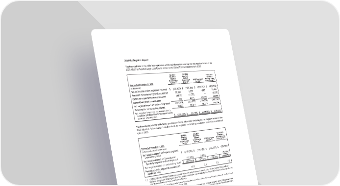 2020 Net Negative Impact The financial data in the table below provides additional information detailing the net negative impact of the 2020 Weather-Related Large Loss Events on our consolidated financial statements in 2020. Year ended December 31, 2020 Q3 2020 Weather- Related Catastrophe Events (1) Q4 2020 Weather- Related Catastrophe Events (2) 2020 Aggregate Losses (3) Total 2020 Weather- Related Large Loss Events (4) (in thousands) Net claims and claims expenses incurred $ (456,425) $ (129,394) $ (153,757) $ (739,576) Assumed reinstatement premiums earned 68,094 6,323 4,997 79,414 Ceded reinstatement premiums earned (4,019) (1,678) — (5,697) Earned (lost) profit commissions 837 2,774 (6,270) (2,659) Net negative impact on underwriting result (391,513) (121,975) (155,030) (668,518) Redeemable noncontrolling interest 92,823 36,811 45,270 174,904 Net negative impact on net income (loss) available (attributable) to RenaissanceRe common shareholders $ (298,690) $ (85,164) $ (109,760) $ (493,614) The financial data in the table below provides additional information detailing the net negative impact of the 2020 Weather-Related Large Loss Events on our segment underwriting results and consolidated combined ratio in 2020. Year ended December 31, 2020 Q3 2020 Weather- Related Catastrophe Events (1) Q4 2020 Weather- Related Catastrophe Events (2) 2020 Aggregate Losses (3) Total 2020 Weather- Related Large Loss Events (4) (in thousands, except percentages) Net negative impact on Property segment underwriting result $ (378,674) $ (118,150) $ (155,030) $ (651,854) Net negative impact on Casualty and Specialty segment underwriting result (12,839) (3,825) — (16,664) Net negative impact on underwriting result $ (391,513) $ (121,975) $ (155,030) $ (668,518) Percentage point impact on consolidated combined ratio 10.0 3.1 3.9 17.2 (1) “Q3 2020 Weather-Related Catastrophe Events” includes Hurricane Laura, Hurricane Sally, the third quarter 2020 wildfires in California, Oregon and Washington, other third quarter catastrophe events including the August 2020 derecho which impacted the U.S. Midwest, Hurricane Isaias, and Typhoon Maysak. (2) “Q4 2020 Weather-Related Catastrophe Events” includes Hurricanes Zeta, Delta, Hurricane Eta and wildfires on the West Coast of the United States during the fourth quarter of 2020. (3) “2020 Aggregate Losses” includes loss estimates associated with aggregate loss contracts triggered during 2020 primarily as a result of losses associated with the Q3 2020 Weather-Related Catastrophe Events and Q4 2020 Weather-Related Catastrophe Events. (4) “2020 Weather-Related Large Loss Events” includes the Q3 2020 Weather-Related Catastrophe Events, Q4 2020 Weather- Related Catastrophe Events and the aggregate losses in 2020 described in footnote (3). 76