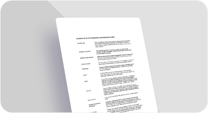 GLOSSARY OF SELECTED INSURANCE AND REINSURANCE TERMS Accident year Year of occurrence of a loss. Claim payments and reserves for claims and claim expenses are allocated to the year in which the loss occurred for losses occurring contracts and in the year the loss was reported for claims made contracts. Acquisition expenses The aggregate expenses incurred by a company for acquiring new business, including commissions, underwriting expenses, premium taxes and administrative expenses. Additional case reserves Additional case reserves represent management’s estimate of reserves for claims and claim expenses that are allocated to specific contracts, less paid and reported losses by the client. Attachment point The dollar amount of loss (per occurrence or in the aggregate, as the case may be) above which excess of loss reinsurance becomes operative. Bordereaux A report providing premium or loss data with respect to identified specific risks. This report is periodically furnished to a reinsurer by the ceding insurers or reinsurers. Bound A (re)insurance contract is considered bound, and the (re)insurer responsible for the risks of the contract, when both parties agree to the terms and conditions set forth in the contract. Broker An intermediary who negotiates contracts of insurance or reinsurance, receiving a commission for placement and other services rendered, between (1) a policy holder and a primary insurer, on behalf of the insured party, (2) a primary insurer and reinsurer, on behalf of the primary insurer, or (3) a reinsurer and a retrocessionaire, on behalf of the reinsurer. Capacity The percentage of surplus, or the dollar amount of exposure, that an insurer or reinsurer is willing or able to place at risk. Capacity may apply to a single risk, a program, a line of business or an entire book of business. Capacity may be constrained by legal restrictions, corporate restrictions or indirect restrictions. Case reserves Loss reserves, established with respect to specific, individual reported claims. Casualty insurance or reinsurance Insurance or reinsurance that is primarily concerned with the losses caused by injuries to third persons and their property (in other words, persons other than the policyholder) and the legal liability imposed on the insured resulting therefrom. Also referred to as liability insurance. Catastrophe A severe loss, typically involving multiple claimants. Common perils include earthquakes, hurricanes, hailstorms, severe winter weather, floods, fires, tornadoes, typhoons, explosions and other natural or man-made disasters. Catastrophe losses may also arise from acts of war, acts of terrorism and political instability. Catastrophe excess of loss reinsurance A form of excess of loss reinsurance that, subject to a specified limit, indemnifies the ceding company for the amount of loss in excess of a specified retention with respect to an accumulation of losses resulting from a “catastrophe.” Catastrophe-linked securities; cat-linked securities Cat-linked securities are generally privately placed fixed income securities where all or a portion of the repayment of the principal is linked to catastrophic events. This includes securities where the repayment is linked to the occurrence and/or size of, for example, one or more hurricanes or earthquakes, or insured industry losses associated with these catastrophic events. 33