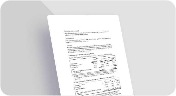 Direct private equity investments Direct private equity investments are the Company’s direct equity investments in companies that are not traded on any nationally recognized equity markets. Fund investments Fund investments are limited partnership or similar interests in private equity funds, private credit funds and hedge funds managed by unrelated third parties. Term loans Term loans represent the Company’s loan participation interest in an underwritten term loan facility. The Company has committed to a loan participation interest of 100 million and as of December 31, 2021 had funded million of its commitment. This facility pays interest, has a -year maturity and is fully secured by a diversified pool of primarily private equity assets. Investments in $ther +entures, under Buity "ethod The table below shows the Company’s portfolio of investments in other ventures, under equity method: 2021 2020 t December 31, $Hnership Carrying +alue $Hnership Carrying +alue Tower "ill Companies (1) 2.0% - 2.0% 2, 2.0% - 2.0% 30,40 Top &ayer Re 0.0% 2,903 0.0% 26,98 Other 22.4% 46,90 2.0% 40,94 Total investments in other ventures, under equity method 98,068 98,33 (1) The Company has equity interests in Bluegrass Insurance Management, &&C, Tower "ill Claims Service, &&C, Tower "ill "oldings, Inc., Tower "ill Insurance Group, &&C, Tower "ill Insurance Managers, &&C, Tower "ill Re "oldings, Inc., Tower "ill Signature Insurance "oldings, Inc. , Tower "ill Risk Management &&C and Tomoka Re "oldings, Inc. (collectively, the VTower "ill CompaniesW). The table below shows the Company’s equity in earnings of other ventures, under equity method: .ear ended December 31, 2021 2020 2019 Top &ayer Re 8,286 9,9 8,801 Tower "ill Companies (2,03) 3,104 10,33 Other 6,096 4,49 4,086 Total equity in earnings of other ventures, under equity method 12,309 1,194 23,224 During 2021, the Company received 33.9 million of distributions from its investments in other ventures, under equity method (2020 R 30.0 million, 2019 R 36. million). Except for Top &ayer Re, which is recorded on a current quarter basis, the equity in earnings of the Company’s investments in other ventures are reported one quarter in arrears. F-28