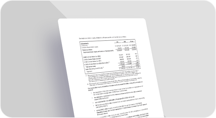 Our total shareholders’ equity attributable to RenaissanceRe and total debt was as follows: At December 31, 2021 2020 Change (in thousands) Common shareholders’ equity $ 5,874,281 $ 7,035,248 $ (1,160,967) Preference shares 750,000 525,000 225,000 Total shareholders’ equity attributable to RenaissanceRe 6,624,281 7,560,248 (935,967) 3.600% Senior Notes due 2029 393,305 392,391 914 3.450% Senior Notes due 2027 297,281 296,787 494 3.700% Senior Notes due 2025 298,798 298,428 370 4.750% Senior Notes due 2025 (DaVinciRe) (1) 148,969 148,659 310 Total senior notes 1,138,353 1,136,265 2,088 Medici Revolving Credit Facility (2) 30,000 — 30,000 Total debt $ 1,168,353 $ 1,136,265 $ 32,088 (1) RenaissanceRe owns a noncontrolling economic interest in its joint venture DaVinciRe. Because RenaissanceRe controls a majority of DaVinciRe’s outstanding voting rights, the consolidated financial statements of DaVinciRe are included in the consolidated financial statements of RenaissanceRe. However, RenaissanceRe does not guarantee or provide credit support for DaVinciRe and RenaissanceRe’s financial exposure to DaVinciRe is limited to its investment in DaVinciRe’s shares and counterparty credit risk arising from reinsurance transactions. (2) RenaissanceRe owns a noncontrolling economic interest in Medici. Because RenaissanceRe controls all of Medici’s outstanding voting rights, the financial statements of Medici are included in RenaissanceRe’s consolidated financial statements. Our shareholders’ equity attributable to RenaissanceRe decreased $0.9 billion during 2021 principally as a result of: • the repurchase of 6.6 million common shares in open market transactions at an aggregate cost of $1.0 billion and an average price of $156.78 per common share; • the redemption of all Series E 5.375% Preference Shares for $275.0 million plus accrued and unpaid dividends thereon; • our comprehensive loss attributable to RenaissanceRe of $38.4 million; and • $67.8 million and $33.3 million of dividends on our common and preference shares, respectively; and partially offset by • raising $500.0 million in gross proceeds in July 2021 through the issuance of 20,000,000 Depositary Shares, each of which represents a 1/1,000th interest in a share of our 4.20% Series G Preference Shares. Our debt increased $32.1 million during the year ended December 31, 2021 principally as a result of $30.0 million that was drawn under the Medici Revolving Credit Facility. For additional information related to the terms of our debt and significant credit facilities, see “Note 9. Debt and Credit Facilities” in our “Notes to the Consolidated Financial Statements.” See “Note 12. Shareholders’ Equity” in our “Notes to the Consolidated Financial Statements” for additional information related to our common and preference shares. 97