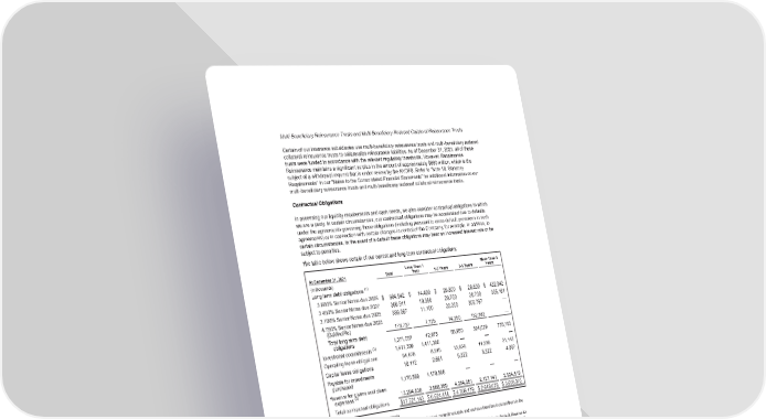Multi-Beneficiary Reinsurance Trusts and Multi-Beneficiary Reduced Collateral Reinsurance Trusts Certain of our insurance subsidiaries use multi-beneficiary reinsurance trusts and multi-beneficiary reduced collateral reinsurance trusts to collateralize reinsurance liabilities. As o f December 31, 2021, all of these trusts were funded in accordance with the relevant regulatory thresholds. However, Renaissance Reinsurance maintains a significant surplus in the amount of approximately $660 million, which is the subject of a withdrawal request that is under review by the NYDFS. Refer to “Note 18. Statutory Requirements” in our “Notes to the Consolidated Financial Statements” for additional information on our multi-beneficiary reinsurance trusts and multi-beneficiary reduced collateral reinsurance trusts. Contractual Obligations In assessing our liquidity requirements and cash needs, we also consider contractual obligations to which we are a party. In certain circumstances, our contractual obligations may be accelerated due to defaults under the agreements governing those obligations (including pursuant to cross-default provisions in such agreements) or in connection with certain changes in control of the Company, for example. In addition, in certain circumstances, in the event of a default these obligations may bear an increased interest rate or be subject to penalties. T he table below shows certain of our current and long-term contractual obligations: At ecem3er )otal Less )han .ear .ears .ears "ore )han .ears (in thousands) Long term debt obligations (1) 3.600% Senior Notes due 2029 $ 504,942 $ 14,400 $ 28,800 $ 28,800 $ 432,942 3.450% Senior Notes due 2027 356,911 10,350 20,700 20,700 305,161 3.700% Senior Notes due 2025 336,067 11,100 22,200 302,767 — 4.750% Senior Notes due 2025 (DaVinciRe) 173,737 7,125 14,250 152,362 — Total long term debt obligations 1,371,657 42,975 85,950 504,629 738,103 Investment commitments (2) 1,411,306 1,411,306 — — — Operating lease obligations 54,870 8,515 13,626 11,586 21,143 Capital lease obligations 18,112 2,661 5,322 5,322 4,807 Payable for investments purchased 1,170,568 1,170,568 — — — Reserve for claims and claim expenses (3) 13,294,630 3,988,389 4,254,281 2,127,141 2,924,819 Total contractual obligations $ 17,321,143 $ 6,624,414 $ 4,359,179 $ 2,648,678 $ 3,688,872 (1) Includes contractual interest payments. (2) The investment commitments do not have a defined contractual commitment date and we have therefore included them in the less than one year category. (3) The amount and timing of the cash flows associated with our policy liabilities are highly uncertain. Refer to “Note 8. Reserve for Claims and Claim Expenses” in our “Notes to the Consolidated Financial Statements” for more information on our estimate of claims and claim expense reserves. 93