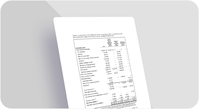 Below is a summary of the assets and liabilities that are measured at fair value on a recurring basis and also represents the carrying amount on the Company’s consolidated balance sheets: At December 31, 2021 Total Quoted Prices in Active Markets for Identical Assets (Level 1) Significant Other Observable Inputs (Level 2) Significant Unobservable Inputs (Level 3) Fixed maturity investments U.S. treasuries $ 6,247,779 $ 6,247,779 $ — $ — Agencies 361,684 — 361,684 — Non-U.S. government 549,613 — 549,613 — Non-U.S. government-backed corporate 474,848 — 474,848 — Corporate 3,214,438 — 3,214,438 — Agency mortgage-backed 721,955 — 721,955 — Non-agency mortgage-backed 233,346 — 233,346 — Commercial mortgage-backed 634,925 — 634,925 — Asset-backed 1,068,543 — 1,068,543 — Total fixed maturity investments 13,507,131 6,247,779 7,259,352 — Short term investments 5,298,385 — 5,298,385 — Equity investments trading 546,016 546,016 — — Other investments Catastrophe bonds 1,104,034 — 1,104,034 — Direct private equity investments 88,373 — — 88,373 Term loans 74,850 74,850 1,267,257 — 1,104,034 163,223 Fund investments (1) 725,802 Total other investments 1,993,059 — 1,104,034 163,223 Other assets and (liabilities) Assumed and ceded (re)insurance contracts (2) (4,727) — — (4,727) Derivative assets (3) 17,889 1,067 16,822 — Derivatives liabilities (3) (16,954) (1,598) (15,356) — Total other assets and (liabilities) (3,792) (531) 1,466 (4,727) $ 21,340,799 $ 6,793,264 $ 13,663,237 $ 158,496 (1) Fund investments, which are comprised of private equity funds, private credit funds, and hedge funds are measured at fair value using the net asset value per share (or its equivalent) as a practical expedient and have not been classified in the fair value hierarchy. The fair value amounts presented in this table are intended to permit reconciliation of the fair value hierarchy to the amounts presented in the consolidated balance sheet. (2) Included in assumed and ceded (re)insurance contracts at December 31, 2021 was $6.1 million of other assets and $10.8 million of other liabilities. (3) Refer to “Note 19. Derivative Instruments” for additional information related to the fair value, by type of contract, of derivatives entered into by the Company. F-30