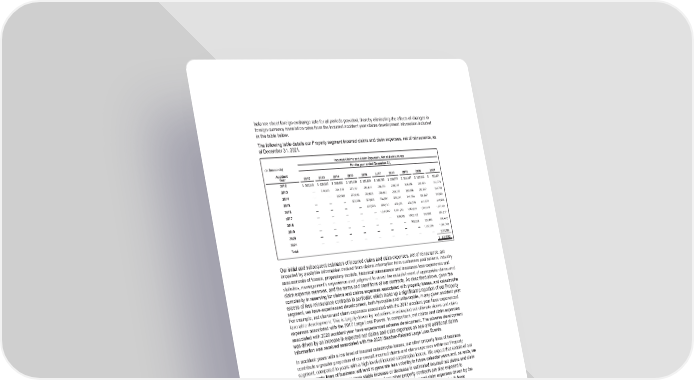 balance sheet foreign exchange rate for all periods provided, thereby eliminating the effects of changes in foreign currency translation rates from the incurred accident year claims development information included in the table below. The following table details our Property segment incurred claims and claim expenses, net of reinsurance, as of December 31, 2021. Incurred Claims and Claim Expenses, Net of Reinsurance (in thousands) For the year ended December 31, Accident Year 2012 2013 2014 2015 2016 2017 2018 2019 2020 2021 2012 $ 560,348 $ 429,885 $ 395,605 $ 375,439 $ 358,509 $ 346,756 $ 338,877 $ 334,347 $ 325,042 $ 322,871 2013 — 318,033 294,315 272,191 250,014 238,734 235,016 235,356 238,404 240,779 2014 — — 302,158 278,813 265,569 260,542 259,379 256,845 250,647 247,708 2015 — — — 372,338 357,065 334,099 323,211 311,964 305,847 295,081 2016 — — — — 455,503 469,120 452,922 434,706 415,572 411,698 2017 — — — — — 1,644,982 1,461,953 1,350,684 1,328,419 1,273,461 2018 — — — — — — 938,309 1,020,102 979,598 857,217 2019 — — — — — — — 992,526 956,445 898,472 2020 — — — — — — — — 1,580,564 1,600,743 2021 — — — — — — — — — 2,370,891 Total $ 8,518,921 Our initial and subsequent estimates of incurred claims and claim expenses, net of reinsurance, are impacted by available information derived from claims information from customers and brokers, industry assessments of losses, proprietary models, historical reinsurance and insurance loss experience and statistics, management’s experience and judgment to assist the establishment of appropriate claims and claim expense reserves, and the terms and conditions of our contracts. As described above, given the complexity in reserving for claims and claims expenses associated with property losses, and catastrophe excess of loss reinsurance contracts in particular, which make up a significant proportion of our Property segment, we have experienced development, both favorable and unfavorable, in any given accident year. For example, net claims and claim expenses associated with the 2017 accident year have experienced favorable development. This is largely driven by reductions in estimated net ultimate claims and claim expenses associated with the 2017 Large Loss Events. In comparison, net claims and claim expenses associated with 2020 accident year have experienced adverse development . The adverse development was driven by an increase in expected net claims and claim expenses as new and additional claims information was received associated with the 2020 Weather-Related Large Loss Events. In accident years with a low level of insured catastrophe losses, our other property lines of business contribute a greater proportion of our overall incurred claims and claim expenses within our Property segment, compared to years with a high level of insured catastrophe losses. We expect that certain of our other property lines of business will tend to generate less volatility in future calendar years and, as such, we would expect to see a slower more stable increase or decrease in estimated incurred net claims and claim expenses over time in such business. Certain of our other property contracts are also exposed to catastrophe events, resulting in increased volatility of incurred claims and claim expenses driven by the occurrence of catastrophe events. In addition, volatility in the initial estimate associated with large catastrophe losses and the speed at which we settle claims can vary significantly based on the type of event. We also anticipate that losses from the COVID-19 pandemic will be highly complex and uncertain, given the unprecedented situation, and will take longer to develop given the nature of the losses, thus potentially adding volatility to our incurred net claims and claim expenses. Sensitivity Analysis The table below shows the impact on our reserve for claims and claim expenses, net income (loss) and shareholders’ equity as of and for the year ended December 31, 2021 of a reasonable range of possible outcomes associated with our estimates of gross ultimate losses for claims and claim expenses incurred within our Property segment. The reasonable range of possible outcomes is based on a distribution of 62