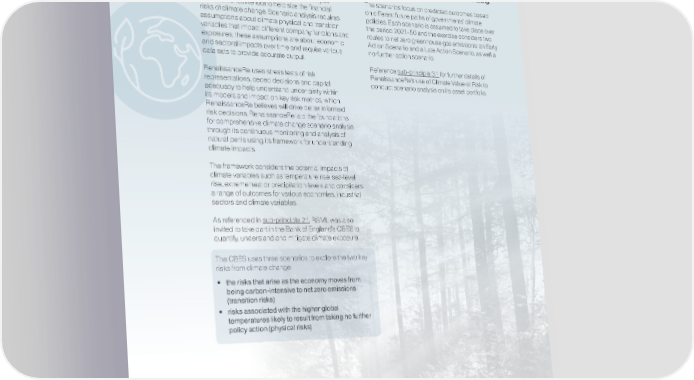 Principle 2 - Incorporate climate-related issues into our strategies and investments (continued) 2.3 Incorporate the material outcomes of climate risk scenarios into business (and investment) decision making. RenaissanceRe believes that scenario analysis The scenarios focus on predicted outcomes based can be an effective tool to help size the financial on different future paths of governments’ climate risks of climate change. Scenario analysis requires policies. Each scenario is assumed to take place over assumptions about climate physical and transition the period 2021–50 and the exercise considers two variables that impact different company functions and routes to net zero greenhouse gas emissions: an Early exposures; these assumptions are about economic Action Scenario and a Late Action Scenario, as well a and sectoral impacts over time and require various no-further action scenario. data sets to provide accurate output. Reference sub-principle 3.1 for further details of RenaissanceRe uses stress tests of risk RenaissanceRe’s use of Climate Value-at Risk to representations, ceded decisions and capital conduct scenario analysis on its asset portfolio. adequacy to help understand uncertainty within its models and impact on key risk metrics, which RenaissanceRe believes will drive better informed risk decisions. RenaissanceRe laid the foundations for comprehensive climate change scenario analysis through its continuous monitoring and analysis of natural perils using its framework for understanding climate impacts. The framework considers the potential impacts of climate variables such as temperature rise, sea-level rise, extreme heat or precipitation levels and considers a range of outcomes for various economies, industrial sectors and climate variables. As referenced in sub-principle 2.1, RSML was also invited to take part in the Bank of England’s CBES to quantify, understand and mitigate climate exposure. The CBES uses three scenarios to explore the two key risks from climate change: • the risks that arise as the economy moves from being carbon-intensive to net zero emissions (transition risks) • risks associated with the higher global temperatures likely to result from taking no further policy action (physical risks) Page 9
