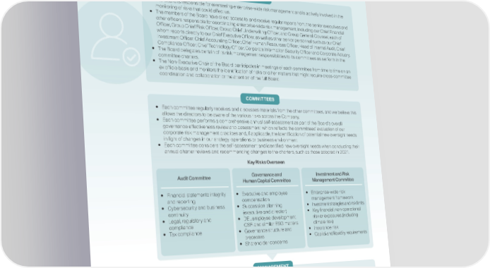 Principle 1 - Be Accountable (continued) Risk Management Process BOARD • The Board is responsible for overseeing enterprise-wide risk management and is actively involved in the monitoring of risks that could affect us. • The members of the Board have direct access to, and receive regular reports from, the senior executives and other officers responsible for coordinating enterprise-wide risk management, including our Chief Financial Officer, Group Chief Risk Officer, Group Chief Underwriting Officer, and Group General Counsel, each of whom reports directly to our Chief Executive Officer, as well as other senior personnel such as our Chief Investment Officer, Chief Accounting Officer, Chief Human Resources Officer, Head of Internal Audit, Chief Compliance Officer, Chief Technology Officer, Corporate Information Security Officer and Corporate Actuary. • The Board delegates certain of its risk management responsibilities to its committees as set forth in the committee charters. • The Non-Executive Chair of the Board participates in meetings of each committee from time to time on an ex officio basis and monitors the identification of risks or other matters that might require cross-committee coordination and collaboration or the attention of the full Board. COMMITTEES • Each committee regularly receives and discusses materials from the other committees, and we believe this allows the directors to be aware of the various risks across the Company. • Each committee performs a comprehensive annual self-assessment as part of the Board’s overall governance effectiveness review and assessment, which reflects the committees’ evaluation of our corporate risk management practices and, if applicable, the identification of potential new oversight needs in light of changes in our strategy, operations or business environment. • Each committee considers the self-assessment and identified new oversight needs when conducting their annual charter reviews and recommending changes to the charters, such as those adopted in 2021. Key Risks Overseen Audit Committee Governance and Investment and Risk Human Capital Committee Management Committee • Financial statements integrity • Executive and employee • Enterprise-wide risk and reporting compensation management framework • Cybersecurity and business • Succession planning • Investment strategies and risk limits continuity (executive and director) • Key financial, non-operational • Legal, regulatory and • DEI, employee development, risk or exposures (including compliance CSR and similar ESG matters climate risk) • Tax compliance • Governance structure and • Insurance risk processes • Capital and liquidity requirements • Shareholder concerns MANAGEMENT • At least annually, our Chief Risk Officer presents a comprehensive risk management overview to the Board to demonstrate management coverage and Board oversight of significant identified risks. This overview outlines our procedures for the identification and measurement of, response to, and monitoring and reporting of risk. • Management representatives from our risk, legal, regulatory, compliance, human resources, treasury, finance, investments, reserving, information security, accounting and internal audit functions: – Regularly report to the Board and each committee at quarterly scheduled sessions, including at least annually to the Governance and Human Capital Committee regarding the potential risks of our compensation policies and practices; and – Separately meet with, and are interviewed by, our committees in executive sessions. Page 4