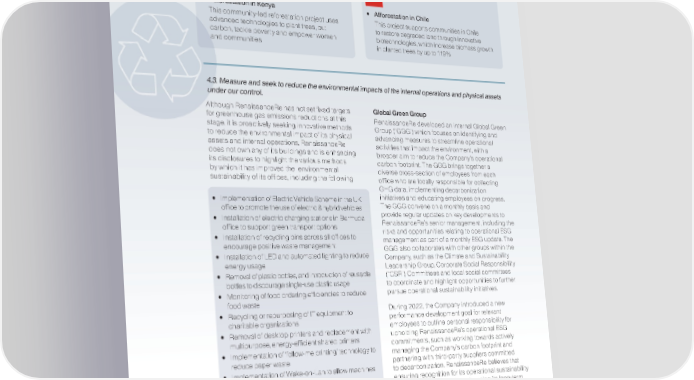 Principle 4 - Reduce the environmental impact of our business (continued) • Reforestation in Kenya • Afforestation in Chile This community-led reforestation project uses This project supports communities in Chile advanced technologies to plant trees, cut to restore degraded land through innovative carbon, tackle poverty and empower women biotechnologies, which increase biomass growth and communities in planted trees by up to 119% 4.3. Measure and seek to reduce the environmental impacts of the internal operations and physical assets under our control. Although RenaissanceRe has not set fixed targets Global Green Group for greenhouse gas emissions reductions at this RenaissanceRe developed an internal Global Green stage, it is proactively seeking innovative methods Group (“GGG”) which focuses on identifying and to reduce the environmental impact of its physical advancing measures to streamline operational assets and internal operations. RenaissanceRe activities that impact the environment, with a does not own any of its buildings and is enhancing broader aim to reduce the Company’s operational its disclosures to highlight the various methods carbon footprint. The GGG brings together a by which it has improved the environmental diverse cross-section of employees from each sustainability of its offices, including the following: office who are locally responsible for collecting GHG data, implementing decarbonization • Implementation of Electric Vehicle Scheme in the UK initiatives and educating employees on progress. office to promote the use of electric & hybrid vehicles The GGG convene on a monthly basis and • Installation of electric charging stations in Bermuda provide regular updates on key developments to office to support green transport options RenaissanceRe’s senior management, including the • Installation of recycling bins across all offices to risks and opportunities relating to operational ESG encourage positive waste management management as part of a monthly ESG update. The GGG also collaborates with other groups within the • Installation of LED and automated lighting to reduce Company, such as the Climate and Sustainability energy usage Leadership Group, Corporate Social Responsibility • Removal of plastic bottles, and introduction of reusable (“CSR”) Committees and local social committees bottles to discourage single-use plastic usage to coordinate and highlight opportunities to further • Monitoring of food ordering efficiencies to reduce pursue operational sustainability initiatives. food waste • Recycling or repurposing of IT equipment to During 2022, the Company introduced a new charitable organizations performance development goal for relevant • Removal of desktop printers and replacement with employees to outline personal responsibility for multipurpose, energy-efficient shared printers upholding RenaissanceRe’s operational ESG commitments, such as working towards actively • Implementation of ‘follow-me printing’ technology to managing the Company’s carbon footprint and reduce paper waste partnering with third-party suppliers committed • Implementation of Wake-on-Lan to allow machines to decarbonization. RenaissanceRe believes that to switch off remotely to save energy ensuring recognition for its operational sustainability • Sourcing sustainable merchandise for successes is important in advancing its long-term RenaissanceRe employees and events sustainability goals. • On site bicycle parking Page 16