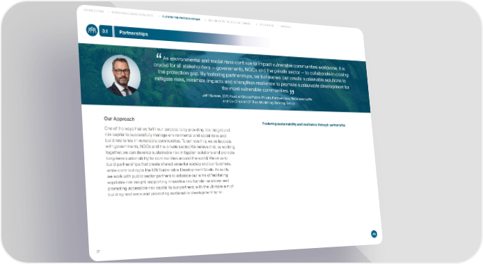 INTRODUCTION PROMOTING CLIMATE RESILIENCE CLOSING THE PROTECTION GAP INDUCING POSITIVE SOCIETAL CHANGE GOVERNANCE APPENDIX 3.1 Partnerships As environmental and social risks continue to impact vulnerable communities worldwide, it is crucial for all stakeholders — governments, NGOs and the private sector — to collaborate in closing FPO the protection gap. By fostering partnerships, we believe we can create sustainable solutions to mitigate risks, minimize impacts and strengthen resilience to promote sustainable development for the most vulnerable communities. Jeff Manson, SVP, Head of Global Public-Private Partnerships, RenaissanceRe and Co-Chair of IDF Risk Modelling Steering Group Our Approach Fostering sustainability and resilience through partnership One of the ways that we fulfill our purpose is by providing risk insight and risk capital to successfully manage environmental and social risks and build resilience in vulnerable communities. To achieve this, we collaborate with governments, NGOs and the private sector. We believe that, by working together, we can develop sustainable risk mitigation solutions and promote long-term sustainability for communities around the world. We strive to build partnerships that create shared value for society and our business, while contributing to the UN Sustainable Development Goals. As such, we work with public sector partners to advance our aims of facilitating equitable risk insight, supporting innovative risk transfer solutions and promoting accessible risk capital to our partners, with the ultimate aim of building resilience and promoting sustainable development for all. 27