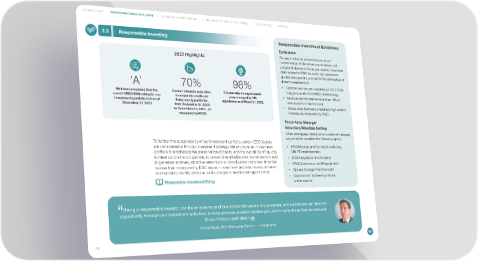 INTRODUCTION PROMOTING CLIMATE RESILIENCE CLOSING THE PROTECTION GAP INDUCING POSITIVE SOCIETAL CHANGE GOVERNANCE APPENDIX 2.3 Responsible Investing Responsible Investment Guidelines Exclusions 2022 Highlights We apply rules-based exclusions to our investment portfolio where our analyses and judgment determine there are material downside risks related to ESG. As such, our investment guidelines currently provide for the elimination of direct investments in: ‘A ’ 70% 98% • Companies that are classified as ‘CCC’ ESG We have calculated that the Carbon intensity reduction Of externally managed assets Laggards under the MSCI methodology. overall MSCI ESG rating for our in corporate credit and were managed by PRI • Companies that derive more than 10% of investment portfolio is A as of listed equity portfolios, signatories as of March 31, 2023. revenues from thermal coal. December 31, 2023. from December 31, 2020 • Corporates that have a relatively high carbon to December 31, 2022 , as intensity as measured by MSCI. measured by MSCI. Third-Party Manager Selection/Mandate Setting When we engage a third-party investment manager, we generally consider the following topics: To further the sustainability of our investment portfolio, certain ESG factors are considered within our investment strategy. We structure our investment • ESG Strategy and Oversight (including portfolio to emphasize the preservation of capital and the availability of liquidity UN PRI membership.) to meet our claims obligations, to be well diversified across market sectors and • ESG Integration and Analysis. to generate relatively attractive returns on a risk-adjusted basis over time. We • ESG Governance and Engagement. believe that incorporating ESG into our investment process makes us better • Climate Change Risk Oversight. positioned to identify attractive and sustainable investment opportunities. • Commitment to Diversity, Equity Responsible Investment Policy and Inclusion. Being a responsible investor can be an extension of our corporate values and purpose, and we believe we have the opportunity, through our investment activities, to help address societal challenges, particularly those that are relevant to our mission and vision. Adrian Doyle, SVP, Managing Director — Investments 19