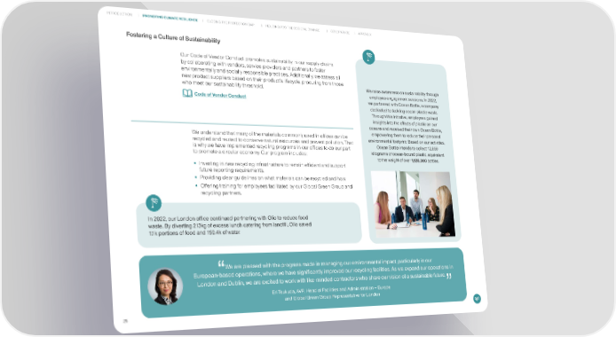 INTRODUCTION PROMOTING CLIMATE RESILIENCE CLOSING THE PROTECTION GAP INDUCING POSITIVE SOCIETAL CHANGE GOVERNANCE APPENDIX Fostering a Culture of Sustainability Our Code of Vendor Conduct promotes sustainability in our supply chains by collaborating with vendors, service providers and partners to foster environmentally and socially responsible practices. Additionally, we assess all new product suppliers based on their product’s lifecycle, procuring from those who meet our sustainability threshold. We raise awareness on sustainability through employee engagement sessions. In 2022, Code of Vendor Conduct we partnered with Ocean Bottle, a company dedicated to tackling ocean plastic waste. Through this initiative, employees gained insights into the effects of plastic on our oceans and received their own Ocean Bottle, We understand that many of the materials commonly used in offices can be empowering them to reduce their personal recycled and reused to conserve natural resources and prevent pollution. That environmental footprint. Based on our activities, is why we have implemented recycling programs in our offices to do our part Ocean Bottle intends to collect 12,859 to promote a circular economy. Our program includes: kilograms of ocean-bound plastic, equivalent to the weight of over 1,128,000 bottles. • Investing in new recycling infrastructure to remain efficient and support future reporting requirements. • Providing clear guidelines on what materials can be recycled and how. • Offering training for employees facilitated by our Global Green Group and recycling partners. In 2022, our London office continued partnering with Olio to reduce food waste. By diverting 213kg of excess lunch catering from landfill, Olio saved 1.1k portions of food and 159.4k of water. We are pleased with the progress made in managing our environmental impact, particularly in our European-based operations, where we have significantly improved our recycling facilities. As we expand our operations in London and Dublin, we are excited to work with like-minded contractors who share our vision of a sustainable future. Eri Tsukuda, AVP, Head of Facilities and Administration – Europe and Global Green Group Representative for London 2525