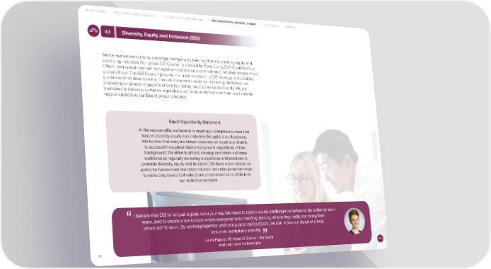 INTRODUCTION PROMOTING CLIMATE RESILIENCE CLOSING THE PROTECTION GAP INDUCING POSITIVE SOCIETAL CHANGE GOVERNANCE APPENDIX 4.1 Diversity, Equity and Inclusion (DEI) We believe we are building a stronger company by seeking diversity, creating equity and practicing inclusion. Our global DEI Council is chaired by Ross Curtis, EVP, Chief Portfolio Officer, and operationalized through five local advisory committees (LAC) that represent our global offices. The DEI Council governs the implementation of DEI strategy and provides guidance on its development. The LACs are responsible for modeling DEI behaviors, promoting employee engagement and facilitating local activities and events. We are dedicated to fostering a diverse, equitable and inclusive work environment and provide regular updates to our Board on our progress. Equal Opportunity Statement At RenaissanceRe, we believe in creating a workplace culture that fosters diversity, equity and inclusion throughout our business. We believe that every individual deserves an equal opportunity to succeed throughout their employment, regardless of their background. We strive to attract, develop and retain a diverse workforce by regularly reviewing our policies and practices to promote diversity, equity and inclusion. We have a zero tolerance policy for harassment and discrimination and take proactive steps to make employees feel valued and empowered to contribute to our collective success. I believe that DEI is not just a goal, but a journey. We need to continuously challenge ourselves to do better, to learn more, and to create a workplace where everyone feels like they belong, where they really can bring their whole self to work. By working together and being open to feedback, we can make our vision of a truly inclusiv e workplace a reality. Laura Pepper, VP, Head of Claims – Bermuda and LAC Lead for Bermuda 34