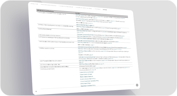 INTRODUCTION PROMOTING CLIMATE RESILIENCE CLOSING THE PROTECTION GAP INDUCING POSITIVE SOCIETAL CHANGE GOVERNANCE APPENDIX GRI Standard and Disclosure Location 2-13 Delegation of responsibility for managing impacts 2022 Form 10-K: Enterprise Risk Management, page 14; Environmental and Climate Change Matters, page 15; Human Capital Resources Oversight, page 18 2023 Proxy Statement: Environmental and Corporate Citizenship Highlights, pages 9–10; Board Structure and Processes, page 27; Risk Oversight, page 35; Board Oversight of ESG, page 37 Sustainability Governance, page 47 2023 ClimateWise Report, pages 4–5 2-14 Role of the highest governance body in sustainability reporting 2023 Proxy Statement: Board Structure and Processes, page 27; Board Oversight of ESG, page 37 Sustainability Governance, page 47 2-15 Conflicts of interest 2023 Proxy Statement: Communicating with the Board, page 30; Certain Relationships and Related Transactions, pages 32–34 Corporate Governance Guidelines: Change of Status, page 7; Director Service on Multiple Boards, page 8 2-16 Communication of critical concerns 2023 Proxy Statement: Communicating with the Board, page 30; Risk Management Process, page 36 2-17 Collective knowledge of the highest governance body 2023 Proxy Statement: Director Orientation and Continuing Education, page 26 Corporate Governance Guidelines: Director Orientation and Continuing Education, page 8 2-18 Evaluation of the performance of the highest governance body 2023 Proxy Statement: Annual Board Assessment and Evaluation, page 26 Sustainability Governance, page 47 Corporate Governance Guidelines: CEO Performance Evaluation, page 2; Board Effectiveness Review, page 3 2-19 Remuneration policies 2022 Form 10-K: Stock Incentive Compensation and Employee Benefit Plans, pages F-75–F-79 2023 Proxy Statement: Director Compensation, pages 38–39; Compensation Discussion and Analysis, starting on page 43 Rewards and Benefits, page 41 Corporate Governance Guidelines: Review of Financial Goals and Performance, page 1; Compensation of Executive Officers, page 2; Director Compensation and Share Ownership, pages 8–9 2-20 Process to determine remuneration 2023 Proxy Statement: Director Compensation, pages 38–39; Compensation Discussion and Analysis, starting on page 43 2-21 Annual total compensation ratio 2023 Proxy Statement: Pay Ratio Disclosure, page 75 2-22 Statement on sustainable development strategy A Message From Our CEO, page 3 2-23 Policy commitments Our United Nations Commitments, page 9; The Humanitarian Sector, pages 30–31; Our Approach, page 46; Our Governance Documents, page 48 Code of Ethics and Conduct Code of Vendor Conduct Modern Slavery Statement Human and Labor Rights Policy Occupational Health and Safety Policy Environmental Policy Responsible Investment Policy 58