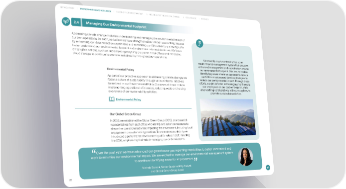 INTRODUCTION PROMOTING CLIMATE RESILIENCE CLOSING THE PROTECTION GAP INDUCING POSITIVE SOCIETAL CHANGE GOVERNANCE APPENDIX 2.4 Managing Our Environmental Footprint Addressing climate change includes understanding and managing the environmental impact of our own operations. As such, we believe we have strengthened our carbon accounting process by enhancing our data collection capabilities and expanding our GHG inventory, allowing us to better understand our environmental footprint and make more informed decisions. We focus on tangible actions, such as implementing recycling programs in our offices and increasing cloud storage, to continue to promote sustainability throughout our operations. We recently implemented Hydrus.ai, an environmental management system that provides enhanced management and coordination around Environmental Policy our environmental footprint. This has helped us identify key areas where we can seek to reduce As part of our proactive approach to addressing climate change, we our GHG emissions and develop strategies to foster a culture of sustainability through various internal initiatives reduce our environmental impact. Through these formalized in our Environmental Policy. Our areas of focus include efforts, we aim to foster active engagement among our employees on our carbon footprint, while implementing operational efficiencies, reducing waste and raising also working collaboratively with our suppliers, to awareness of our sustainability activities. promote sustainable activities. Environmental Policy Our Global Green Group In 2022, we established the Global Green Group (GGG), composed of representatives from each office who identify and advance measures to streamline operational activities impacting the environment, including local engagement on sustainability practices. To promote accountability, we introduced a performance development goal for relevant staff, including the GGG, emphasizing their role in managing our carbon footprint. Over the past year we have advanced our greenhouse gas reporting capabilities to better understand and work to minimize our environmental impact. We are excited to leverage our environmental management system to continue identifying areas for improvement. Michela Borzoni, Senior Sustainability Analyst and Global Green Group Lead 22