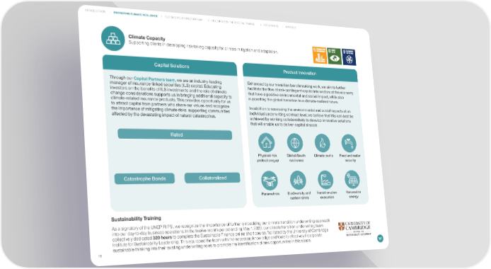 INTRODUCTION PROMOTING CLIMATE RESILIENCE CLOSING THE PROTECTION GAP INDUCING POSITIVE SOCIETAL CHANGE GOVERNANCE APPENDIX Climate Capacity Supporting clients in developing risk-taking capacity for climate mitigation and adaptation. Capital Solutions Product Innovation Through our Capital Partners team, we are an industry-leading Enhanced by our transition benchmarking work, we aim to further manager of insurance-linked securities (ILS) capital. Educating facilitate the flow of risk-contingent capital into sectors of the economy investors on the benefits of ILS investments and the role of climate that have a positive environmental and social impact, while also change considerations supports us in bringing additional capacity to supporting the global transition to a climate-resilient future. climate-related insurance products. This provides opportunity for us to attract capital from partners who share our values and recognize In addition to assessing the environmental and social impacts at an the importance of mitigating climate risks, supporting communities individual underwriting contract level, we believe that this can best be affected by the devastating impact of natural catastrophes. achieved by working collaboratively to develop innovative solutions that will enable us to deliver capital at scale. Rated Physical risk Global South Climate perils Food and water protection gap resilience security Catastrophe Bonds Collateralized Parametrics Biodiversity and Transition plan Renewable carbon sinks execution energy Sustainability Training As a signatory of the UNEP FI PSI, we recognize the importance of further embedding our climate transition underwriting approach into our day-to-day business operations. In the twelve-month period ending May 1, 2023, our climate transition underwriting team collectively dedicated 320 hours to complete the Sustainable Finance online short course, facilitated by the University of Cambridge Institute for Sustainability Leadership. This equipped the team with the necessary knowledge and tools to effectively incorporate sustainable thinking into their existing underwriting roles to promote the identification of new opportunities in this space. 16