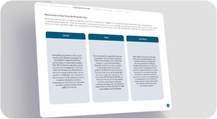 INTRODUCTION PROMOTING CLIMATE RESILIENCE CLOSING THE PROTECTION GAP INDUCING POSITIVE SOCIETAL CHANGE GOVERNANCE APPENDIX Partnerships to Help Close the Protection Gap We are dedicated to making a positive impact on communities by seeking partnerships that build resilience and promote sustainable development. By collaborating with Lloyd’s DRF and other organizations, we leverage our expertise in risk understanding and capital management to support their humanitarian efforts. As a result, we seek to better equip communities with tools and resources they can use to help them face the challenges of an ever-changing world. UNICEF Parsyl Start Ready Alongside our partners in the Lloyd’s We are pleased to support the Essential Start Ready, a financial mechanism market, AXA Climate and Liberty, we Consortium led by Parsyl’s Syndicate employed by the Start Network, pre- are thrilled to support UNICEF by 1796, the first mission-driven syndicate positions funding for predictable participating in a parametric product created in Lloyd’s 330 year history. recurring crises such as floods, that offers financial protection against Essential is the first cargo consortium droughts and heatwaves. In 2022, we cyclone risk in Bangladesh, Comoros, focused specifically on essential supported the development of risk Haiti, Fiji, Madagascar, Mozambique, goods, including the foods we eat and modeling capabilities for the first pool Solomon Islands and Vanuatu. We are the medicines we need. Essential also of countries to join Start Ready. We proud to contribute to the provision of serves as supporting capacity for the continue to monitor the initiative’s aid and support vulnerable populations Global Health Risk Facility (GHRF), an progress and seek future opportunities in regions affected by cyclones, alliance of insurance and technology for engagement as it broadens its leveraging our expertise and resources partners providing cost effective scope to protect more communities to make a positive impact on the insurance coverage and risk mitigation from climate risks for recurring, global community. solutions for vaccines and global health predictable disasters. commodities across the globe. 31