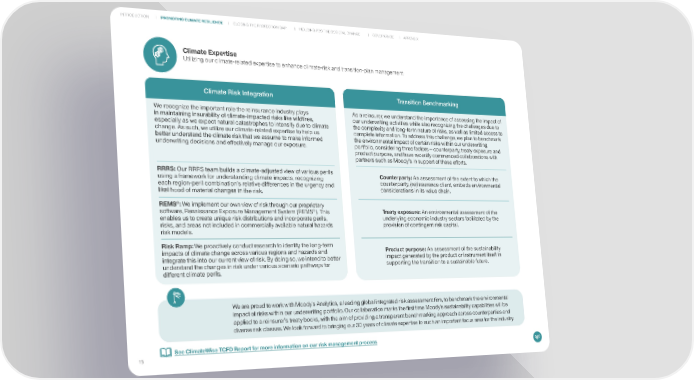 INTRODUCTION PROMOTING CLIMATE RESILIENCE CLOSING THE PROTECTION GAP INDUCING POSITIVE SOCIETAL CHANGE GOVERNANCE APPENDIX Climate Expertise Utilizing our climate-related expertise to enhance climate-risk and transition-plan management Climate Risk Integration Transition Benchmarking We recognize the important role the reinsurance industry plays As a reinsurer, we understand the importance of assessing the impact of in maintaining insurability of climate-impacted risks like wildfires, our underwriting activities while also recognizing the challenges due to especially as we expect natural catastrophes to intensify due to climate the complexity and long-term nature of risks, as well as limited access to change. As such, we utilize our climate-related expertise to help us complete information. To address this challenge, we plan to benchmark better understand the climate risk that we assume to make informed the environmental impact of certain risks within our underwriting underwriting decisions and effectively manage our exposure. portfolio, considering three factors – counterparty, treaty exposure and product purpose, and have recently commenced collaborations with partners such as Moody’s in support of these efforts. RRRS: Our RRRS team builds a climate-adjusted view of various perils Counterparty: An assessment of the extent to which the using a framework for understanding climate impacts, recognizing counterparty, (re)insurance client, embeds environmental each region-peril combination’s relative differences in the urgency and considerations in its value chain. likelihood of material changes in the risk. © REMS : We implement our own view of risk through our proprietary software, Renaissance Exposure Management System (REMS© Treaty exposure: An environmental assessment of the ). This enables us to create unique risk distributions and incorporate perils, underlying economic industry sectors facilitated by the risks, and areas not included in commercially available natural hazards provision of contingent risk capital. risk models. Risk Ramp: We proactively conduct research to identify the long-term impacts of climate change across various regions and hazards and Product purpose: An assessment of the sustainability integrate this into our current view of risk. By doing so, we intend to better impact generated by the product or instrument itself in understand the changes in risk under various scenario pathways for supporting the transition to a sustainable future. different climate perils. We are proud to work with Moody’s Analytics, a leading global integrated risk assessment firm, to benchmark the environmental impact of risks within our underwriting portfolio. Our collaboration marks the first time Moody’s sustainability capabilities will be applied to a reinsurer’s treaty books, with the aim of providing a transparent benchmarking approach across counterparties and diverse risk classes. We look forward to bringing our 30 years of climate expertise to such an important focus area for the industry. See ClimateWise TCFD Report for more information on our risk management process 15