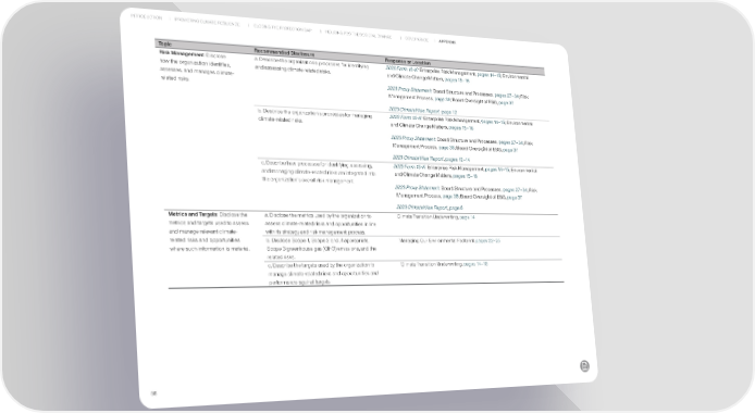 INTRODUCTION PROMOTING CLIMATE RESILIENCE CLOSING THE PROTECTION GAP INDUCING POSITIVE SOCIETAL CHANGE GOVERNANCE APPENDIX Topic Recommended Disclosure Response or Location Risk Management: Disclose a. Describe the organization’s processes for identifying 2022 Form 10-K: Enterprise Risk Management, pages 14–15; Environmental how the organization identifies, and assessing climate-related risks. and Climate Change Matters, pages 15–16 assesses, and manages climate- related risks. 2023 Proxy Statement: Board Structure and Processes, pages 27–34; Risk Management Process, page 36; Board Oversight of ESG, page 37 2023 ClimateWise Report, page 12 b. Describe the organization’s processes for managing 2022 Form 10-K: Enterprise Risk Management, pages 14–15; Environmental climate-related risks. and Climate Change Matters, pages 15–16 2023 Proxy Statement: Board Structure and Processes, pages 27–34; Risk Management Process, page 36; Board Oversight of ESG, page 37 2023 ClimateWise Report , pages 12 – 14 c. Describe how processes for identifying, assessing, 2022 Form 10-K: Enterprise Risk Management, pages 14–15; Environmental and managing climate-related risks are integrated into and Climate Change Matters, pages 15–16 the organization’s overall risk management. 2023 Proxy Statement: Board Structure and Processes, pages 27–34; Risk Management Process, page 36; Board Oversight of ESG, page 37 2023 ClimateWise Report , page 6 Metrics and Targets: Disclose the a. Disclose the metrics used by the organization to Climate Transition Underwriting, page 14 metrics and targets used to assess assess climate-related risks and opportunities in line and manage relevant climate- with its strategy and risk management process. related risks and opportunities b. Disclose Scope 1, Scope 2 and, if appropriate, Managing Our Environmental Footprint, pages 22–25 where such information is material. Scope 3 greenhouse gas (GHG) emissions, and the related risks. c. Describe the targets used by the organization to Climate Transition Underwriting, pages 14–18 manage climate-related risks and opportunities and performance against targets. 56