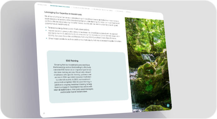 INTRODUCTION PROMOTING CLIMATE RESILIENCE CLOSING THE PROTECTION GAP INDUCING POSITIVE SOCIETAL CHANGE GOVERNANCE APPENDIX Leveraging Our Expertise in Investments We strive to further enhance our understanding of how different sustainability factors impact various asset classes and sectors, while also developing our understanding of climate risk in our investment portfolio. We are also analyzing the performance, liquidity and real-world outcomes of existing and potential future investments in: • Renewable energy, forestry and infrastructure sectors. • Impact, transition, green, sustainable and sustainability-linked bonds aligned with recognized standards like the Sustainability Bond principles by the International Capital Markets Association (ICMA), European Securities and Markets Authority (ESMA) and the Climate Bond Initiative. • Other impact products, such as public and private equity, that may accelerate the global transition. ESG Training Ensuring that our investment personnel have the knowledge and understanding to effectively consider ESG factors is an important part of our decision-making process. We provide relevant employees with specific training, guidance and access to ESG-specialist resources facilitated by external experts. In 2022, our investment personnel completed ESG-focused training, in addition to ongoing investment training, to help them to engage in meaningful discussions with internal stakeholders, third-party asset managers and broader market stakeholders. 21