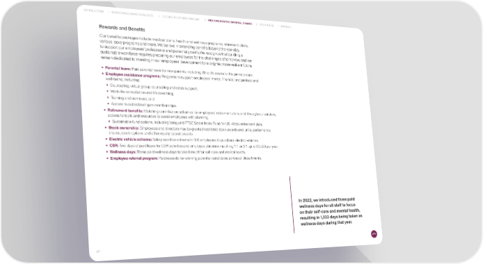 INTRODUCTION PROMOTING CLIMATE RESILIENCE CLOSING THE PROTECTION GAP INDUCING POSITIVE SOCIETAL CHANGE GOVERNANCE APPENDIX Rewards and Benefits Our benefits packages include medical plans, health and wellness programs, retirement plans, various leave programs and more. We believe in extending benefits beyond the workday, to support our employees’ professional and personal growth. We recognize that building a sustainable workforce requires preparing our employees for the challenges of tomorrow, and we remain dedicated to investing in our employees’ development for a brighter, more resilient future. • Parental leave: Paid parental leave for new parents, including 20 to 26 weeks for the primary carer. • Employee assistance programs: Programs to support employees’ mental, financial and professional well-being, including: • Counseling, virtual group counseling and crisis support; • Work-life consultation and life coaching; • Training and seminars; and • Access to subsidized gym memberships. • Retirement benefits: Matching contribution schemes for employees’ retirement plans and, through our vendors, access to tools and resources to assist employees with planning. • Sustainable fund options, including Vanguard FTSE Social Index Fund for US 401(k) retirement plan. • Stock ownership: Employees and directors may be granted restricted stock awards and units, performance shares, stock options and other equity-based awards. • Electric vehicle scheme: Salary sacrifice scheme for UK employees to purchase electric vehicles. • CSR: Two days of paid leave for CSR activities and employee donation matching 1:1 or 2:1 up to $3,500 per year. • Wellness days: Three paid wellness days to take time off for self-care and mental health. • Employee referral program: Paid rewards for referring potential candidates across all departments. In 2022, we introduced three paid wellness days for all staff to focus on their self-care and mental health, resulting in 1,333 days being taken as wellness days during that year. 41