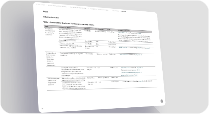 INTRODUCTION PROMOTING CLIMATE RESILIENCE CLOSING THE PROTECTION GAP INDUCING POSITIVE SOCIETAL CHANGE GOVERNANCE APPENDIX SASB Industry: Insurance Table 1. Sustainability Disclosure Topics and Accounting Metrics Topic Accounting Metric Category Unit of Measure Code Response or Location Transparent Total amount of monetary losses as a Quantitative Reporting currency FN-IN-270a.1 2022 Form 10-K: Legal Proceedings, page 46 Information and result of legal proceedings associated The amount of monetary legal losses incurred by the Company Fair Advice for with marketing and communication of as a result of legal proceedings associated with marketing and Customers insurance product-related information communication of insurance product related information to new to new and returning customers and returning customers, if any, is minimal and immaterial. Complaints-to-claims ratio Quantitative Rate FN-IN-270a.2 - Customer retention rate Quantitative Rate FN-IN-270a.3 - Description of approach to informing Discussion and n/a FN-IN-270a.4 2022 Form 10-K: Corporate Strategy, page 4; Marketing, page 17 customers about products Analysis Incorporation of Total invested assets, by industry and Quantitative Reporting currency FN-IN-410a.1 2022 Form 10-K: Investments, pages 87–91 Environmental, asset class Social, and Governance Factors in Investment Management Description of approach to Discussion and n/a FN-IN-410a.2 2022 Form 10-K: Investments, pages 87–91 incorporation of environmental, social, Analysis Responsible Investing, pages 19–21 and governance (ESG) factors in investment management processes 2023 ClimateWise Report, pages 9–11 and strategies Responsible Investment Policy Policies Designed Net premiums written related to energy Quantitative Reporting currency FN-IN-410b.1 - to Incentivize efficiency and low carbon technology Responsible Discussion of products and/or Discussion and n/a FN-IN-410b.2 Climate Transition Underwriting, page 16 (Climate Capacity) Behavior product features that incentivize Analysis health, safety, and/or environmentally responsible actions and/or behaviors 61