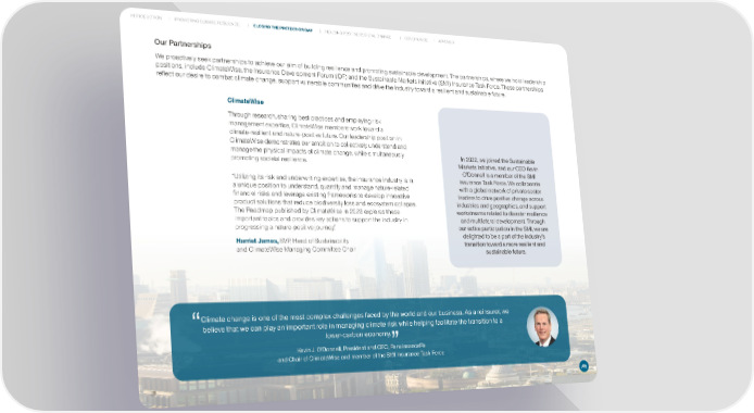 INTRODUCTION PROMOTING CLIMATE RESILIENCE CLOSING THE PROTECTION GAP INDUCING POSITIVE SOCIETAL CHANGE GOVERNANCE APPENDIX Our Partnerships We proactively seek partnerships to achieve our aim of building resilience and promoting sustainable development. The partnerships, where we hold leadership positions, include ClimateWise, the Insurance Development Forum (IDF) and the Sustainable Markets Initiative (SMI) Insurance Task Force. These partnerships reflect our desire to combat climate change, support vulnerable communities and drive the industry toward a resilient and sustainable future. ClimateWise Through research, sharing best practices and employing risk management expertise, ClimateWise members work toward a climate-resilient and nature-positive future. Our leadership position in ClimateWise demonstrates our ambition to collectively understand and manage the physical impacts of climate change, while simultaneously In 2022, we joined the Sustainable promoting societal resilience. Markets Initiative, and our CEO Kevin O’Donnell is a member of the SMI “Utilizing its risk and underwriting expertise, the insurance industry is in Insurance Task Force. We collaborate a unique position to understand, quantify and manage nature-related with a global network of private sector financial risks and leverage existing frameworks to develop innovative leaders to drive positive change across product solutions that reduce biodiversity loss and ecosystem collapse. industries and geographies, and support The Roadmap published by ClimateWise in 2023 explores these workstreams related to disaster resilience important topics and provides key actions to support the industry in and multilateral development. Through progressing a nature-positive journey.” our active participation in the SMI, we are Harriet James, SVP, Head of Sustainability delighted to be a part of the industry’s and ClimateWise Managing Committee Chair transition toward a more resilient and sustainable future. Climate change is one of the most complex challenges faced by the world and our business. As a reinsurer, we believe that we can play an important role in managing climate risk while helping facilitate the transition to a lower-carbon economy. Kevin J. O’Donnell, President and CEO, RenaissanceRe and Chair of ClimateWise and member of the SMI Insurance Task Force 28